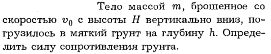 Тело массой m, брошенное со скоростью v0 с высоты H вертикально вниз, погрузилось в мягкий грунт на глубину h. Определить силу сопротивления грунта.