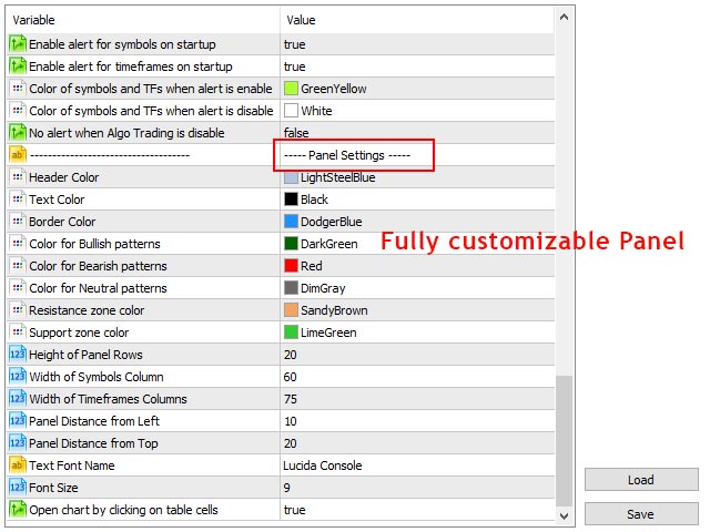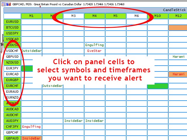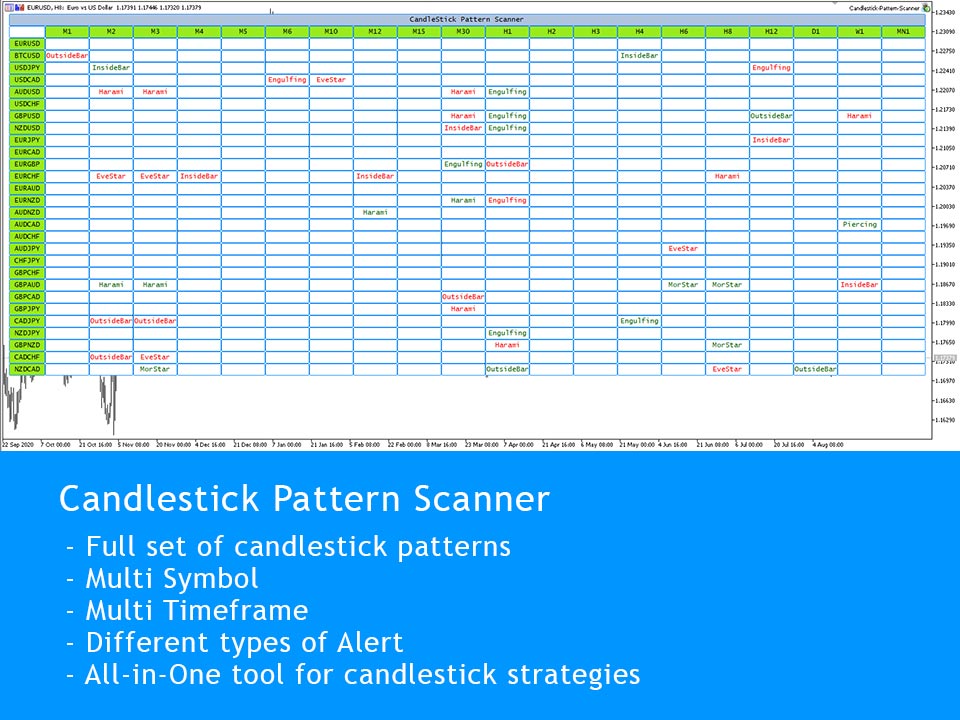 Candlestick Pattern Scanner is a multi-timeframe and multi currency panel and alert that checks all timeframes and symbols for different candlestick patterns that forming on the chart.
