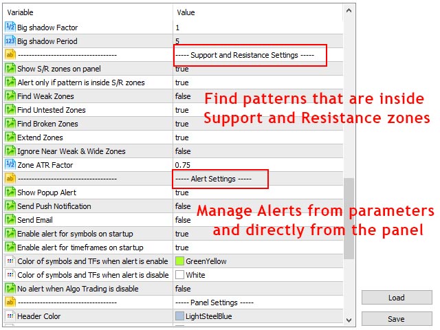 The scanner is combined with support and resistance zones so you can check the candlstick patterns in the must important areas of the chart to find breakout and reversal patterns in the price chart.