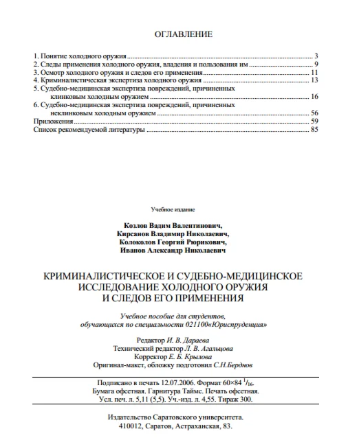 Пособие посвящено комплексному исследованию холодного оружия и следов его применения. Дается понятие и криминалистическая классификация холодного оружия, описываются следы владения и пользования им, правила следственного осмотра и экспертного (криминалистического и судебно-медицинского) исследования указанных объектов.