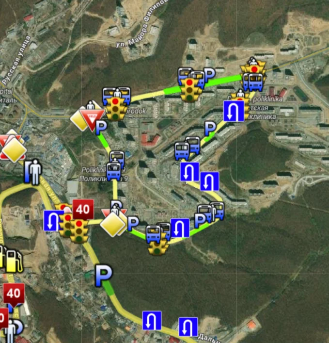 Доступ к дорожной карте района БАМ г. Владивостока с указанием мест разворотов, остановок, дорожных знаков и опасных мест.
