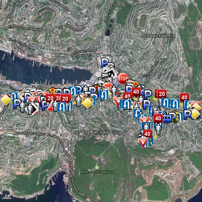 Доступ к дорожной карте района БАМ г. Владивостока с указанием мест разворотов, остановок, дорожных знаков и опасных мест.