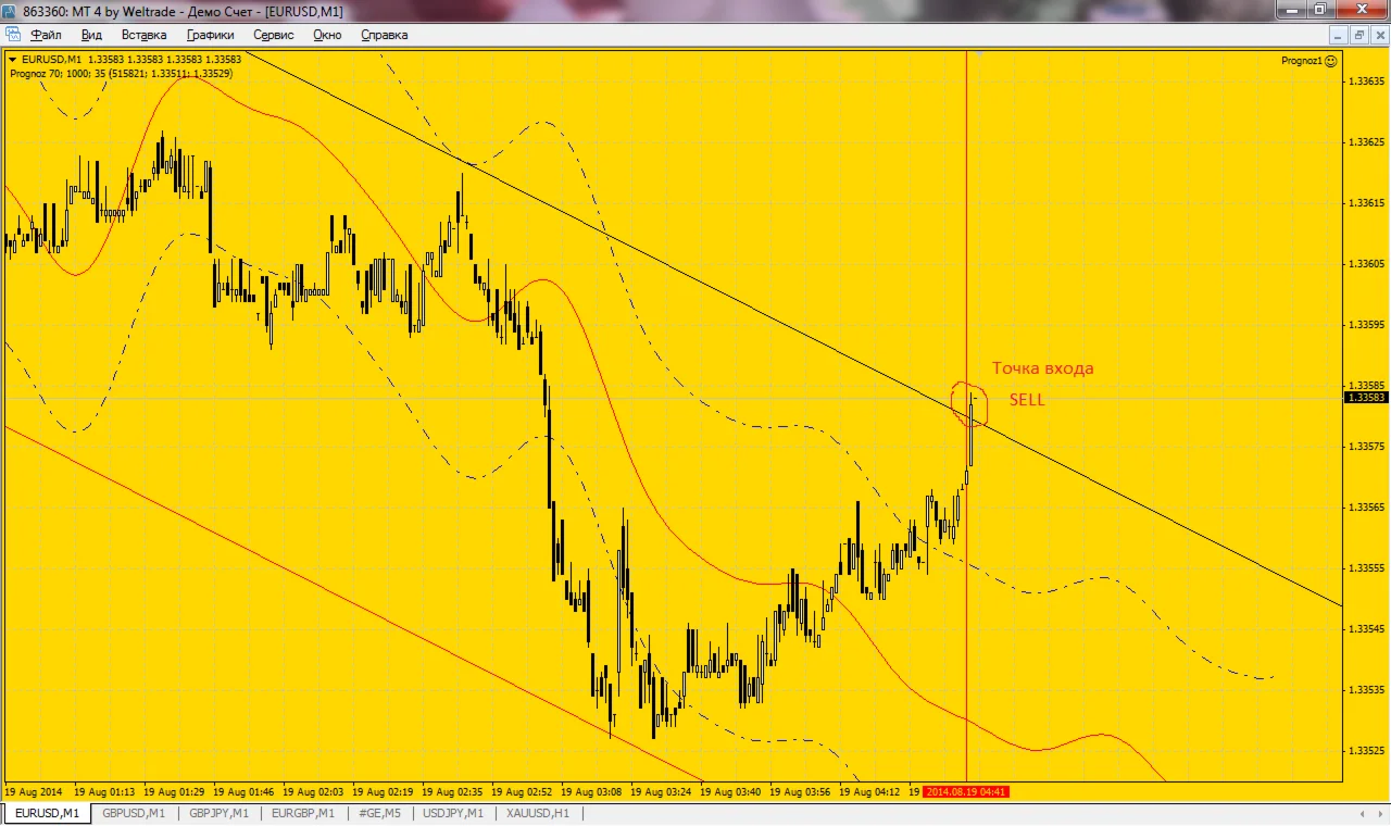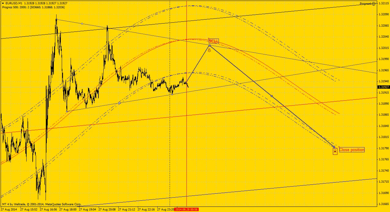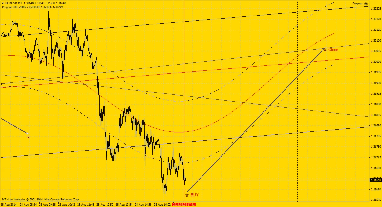 Далее на основании рассчитанного многочлена строится линия расчетного движения валютной пары в истории, которая продолжается на прогнозное количество свечей, заданное параметром Forecast. Также строится канал среднего отклонения фактических закрытий свечей от расчетной линии.
