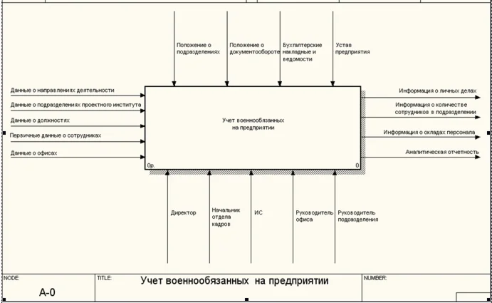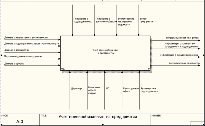 Автоматизированная информационная система учета военнообязанных на предприятии позволяет автоматизировать обработку следующей информации: данные о подразделениях предприятия; данные об офисах проектного института; данные о должностях; данные о сотрудниках; данные о направлениях деятельности; дополнительные данные по сотруднику.