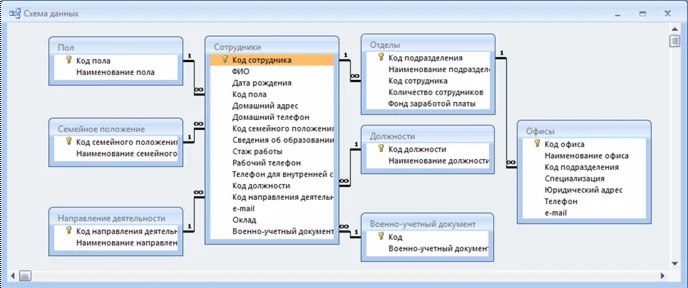 При разработке автоматизированной системы были созданы следующие таблицы: таблица «Пол»; таблица «Семейное положение»; таблица «Направление деятельности»; таблица «Должности»; таблица «Сотрудники»; таблица «Подразделения»; таблица «Офисы». Установлены необходимые связи между ними.