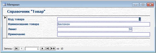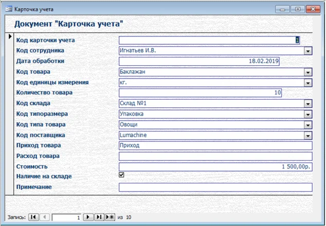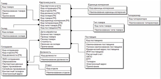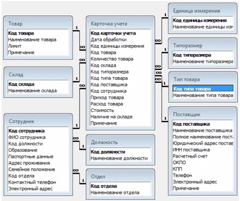 Разработанная база данных информационной системы включает все необходимые таблицы и установлены все необходимые связи между ними. На основании таблиц базы данных были разработаны следующие пользовательские формы: карточка учета; товар; поставщик; сотрудник; должность; отдел; склад; тип товара; типоразмер; единица измерения.