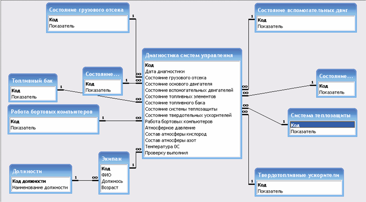 База данных Космический шатл включает информацию о состоянии грузового отсека, состоянии основного двигателя, состоянии вспомогательных двигателей, состоянии топливных элементов, состоянии топливного бака, состоянии твердотопливных ускорителей, состоянии теплозащиты, состоянии бортовых компьютеров, должности и экипаже