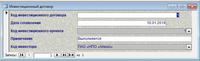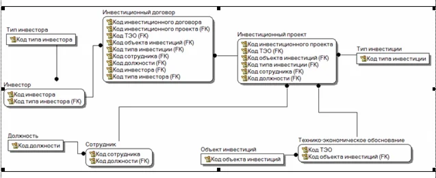 Для сбора первичной информации в информационной системе предусмотрено использование следующих справочников и документов: инвестор; тип инвестора; объект инвестиций; тип инвестиции; сотрудник; должность; инвестиционный договор; инвестиционный проект; технико-экономическое обоснование.