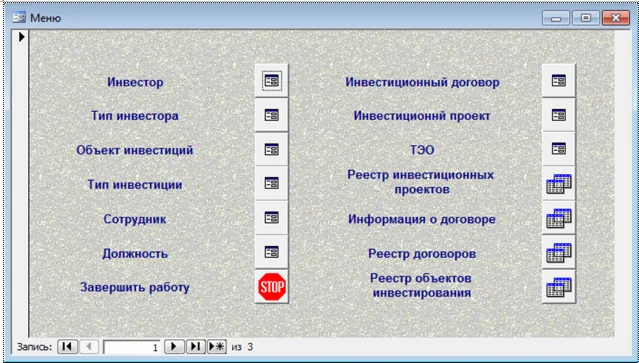 Для обработки данных используются следующие запросы и отчеты: реестр инвестиционных проектов; информация о договоре; реестр договоров; реестр объектов инвестирования. Главное меню информационной системы объединило все программные модули.