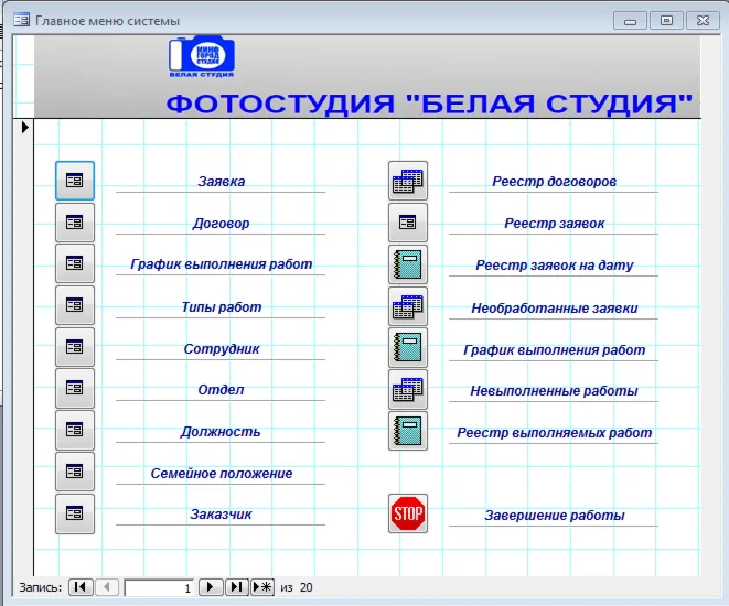 База данных "Фотостудия" предназначена для автоматизации деятельности небольшой фотостудии. Позволяет обрабатывать информацию о заявках, договорах, графиках выполнения работ, типах работ, сотрудниках, отделах, должностях, семейном положении, заказчиках.