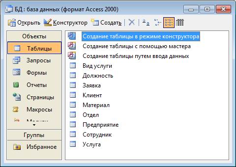 База данных "Парикмахерская" содержит следующие таблицы: предприятие; отдел; сотрудник; должность; вид услуги; услуга; материал; клиент; заявка.