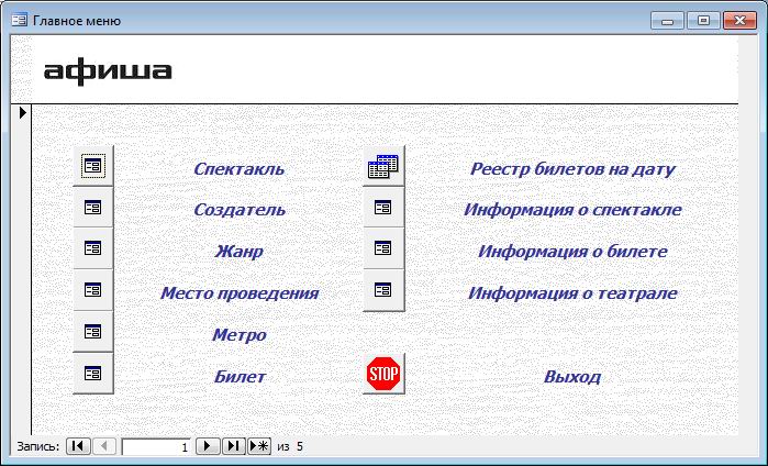 База данных "Театр" предназначена для обработки данных о продаже билетов театральной кассой. Позволяет обрабатывать информацию о спектаклях, создателях, жанрах, местах проведения, метро, билетах.