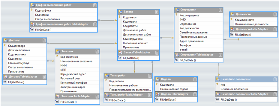 Информационная система "Автомастерская" содержит следующие таблицы: заявка; договор; график выполнения работ; типы работ; сотрудник; отдел; должность; семейное положение; заявка; договор.