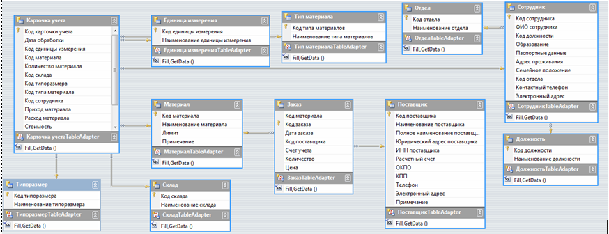 База данных "Конструктор электронной аппаратуры" включает следующие таблицы: карточка учета; заказ; материал; поставщик; сотрудник; должность; отдел; склад; тип материала; типоразмер; единица измерения.