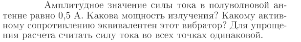 Амплитудное значение силы тока в полуволновой антенне равно 0,5 А. Какова мощность излучения? Какому активному сопротивлению эквивалентен этот вибратор? Для упрощения расчета считать силу тока во всех точках одинаковой.