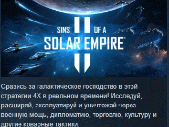 "Sins of a Solar Empire II" — это продолжение критически прославленной космической стратегии, которая идеально сочетает тактику реального времени с глубиной 4X. Будучи одновременно императором и военачальником, вам предстоит возглавить одну из шести играбельных фракций и привести её к победе в борьбе против угрозы вымирания!