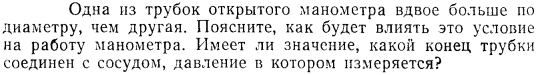 Одна из трубок открытого манометра вдвое больше по диаметру, чем другая. Поясните, как будет влиять это условие на работу манометра. Имеет ли значение, какой конец трубки соединен с сосудом, давление в котором измеряется?