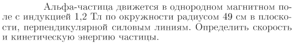 Альфа-частица движется в однородном магнитном поле с индукцией 1,2 Тл по окружности радиусом 49 см в плоскости, перпендикулярной силовым линиям. Определить скорость и кинетическую энергию частицы.