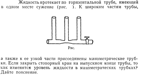 Жидкость протекает по горизонтальной трубе, имеющей в одном месте сужение (рис. ). К широким частям трубы, а также к ее узкой части присоединены манометрические трубки. Если закрыть стопорный кран на выпускном конце трубы, то как изменится уровень жидкости в манометрических трубках? Дайте пояснение.
