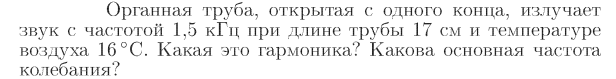 Органная труба, открытая с одного конца, излучает звук с частотой 1,5 кГц при длине трубы 17 см и температуре воздуха 16° С. Какая это гармоника? Какова основная частота колебания?