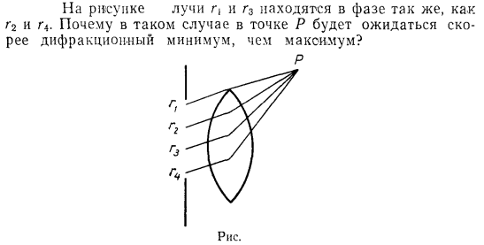 На рисунке лучи r1 и r3 находятся в фазе так же, как r2 и r4. Почему в таком случае в точке Р будет ожидаться скорее дифракционный минимум, чем максимум?