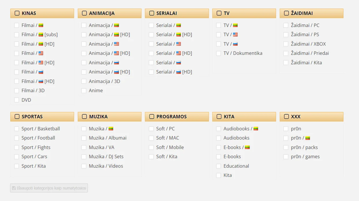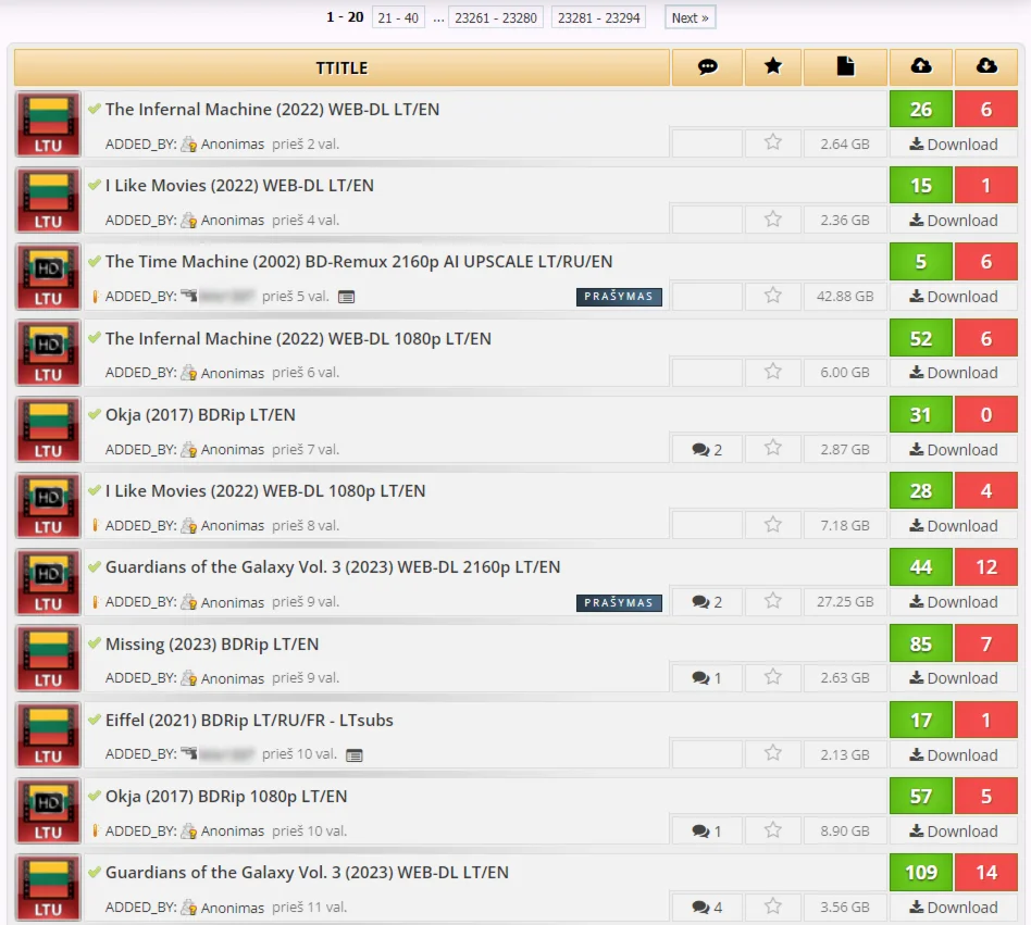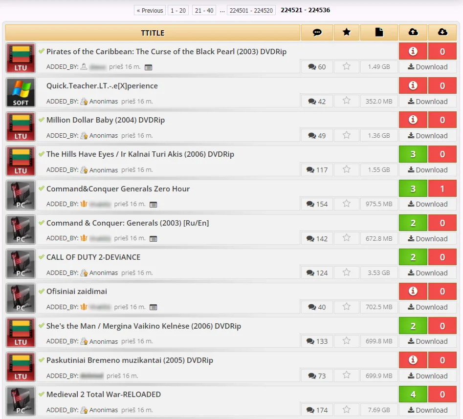 TORRENT.LT - Это хороший Литовский торрент - трекер в категории "всё в одном". На сайте вы найдёте как английский так и русский контент: фильмы, телешоу, музыку, игры, XXX и другое. Весь интерфейс трекера на литовском языке, но вы можете легко перевести его с помощью Google Translation. На данный момент ресурс содержит более 226 000 торрентов. У них также есть внутренняя релиз - группа (TLR). Рейтинг на трекере держать не сложно, благодаря наличию бонусной системы и раздач "freeleech", на которых скачанное не засчитывается.