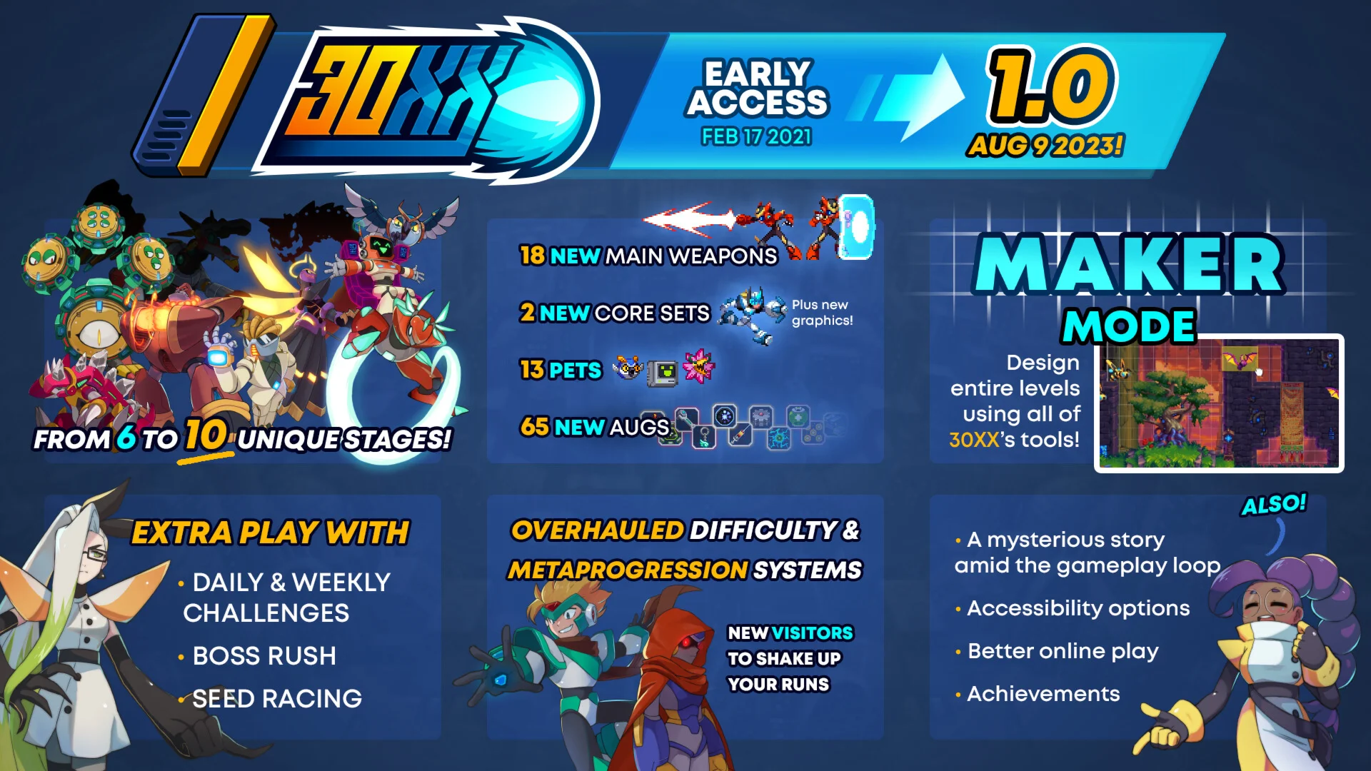 Прыгай, стреляй и проруби свой путь через 30XX, "рогалик" экшн-прыгалка, в который можно играть с другом! Исследуй буйные, постоянно меняющиеся миры, в которых гармонично сочетаются прыжки с ожесточенным боем. Уничтожь их грозных Стражей. Овладей их уникальными Способностями.