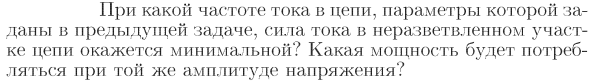 При какой частоте тока в цепи, параметры которой заданы в предыдущей задаче, сила тока в неразветвленном участке цепи окажется минимальной? Какая мощность будет потребляться при той же амплитуде напряжения?