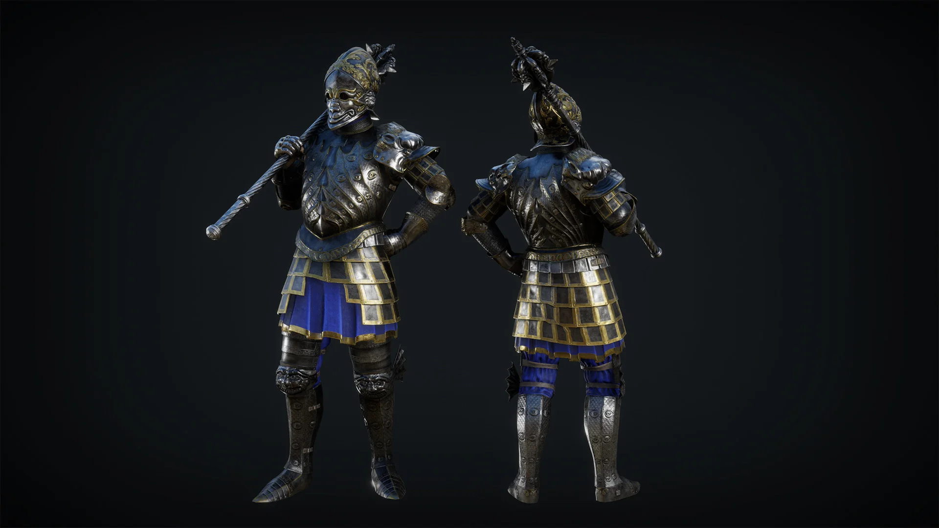 Этот комплект, вдохновленный творениями миланских мастеров эпохи Возрождения, включает двуручную булаву и пугающий комплект гротескных доспехов — воплощение обитателей преисподней в стали.