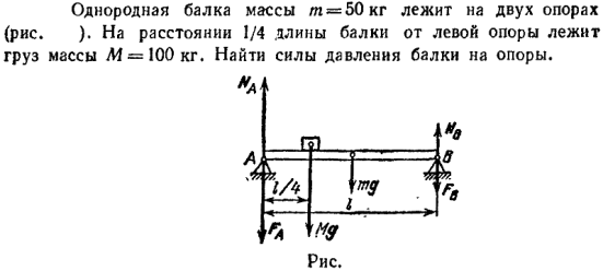 Однородная балка массы m = 50 кг лежит на двух опорах (рис ). На расстоянии 1/4 длины балки от левой опоры лежит груз массы M = 100 кг. Найти силы давления балки на опоры.