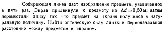 Собирающая линза дает изображение предмета, увеличенное в пять раз. Экран придвинули к предмету на dd = 0,50 м; затем переместили линзу так, что предмет на экране получился в натуральную величину. Найти оптическую силу линзы и первоначальное расстояние между предметом и экраном.