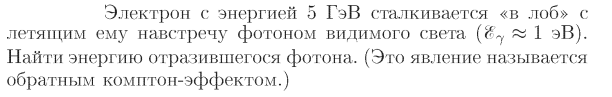 Электрон с энергией 5 ГэВ сталкивается «в лоб» с летящим ему навстречу фотоном видимого света (Ey=1 эВ). Найти энергию отразившегося фотона. (Это явление называется обратным комптон-эффектом.)