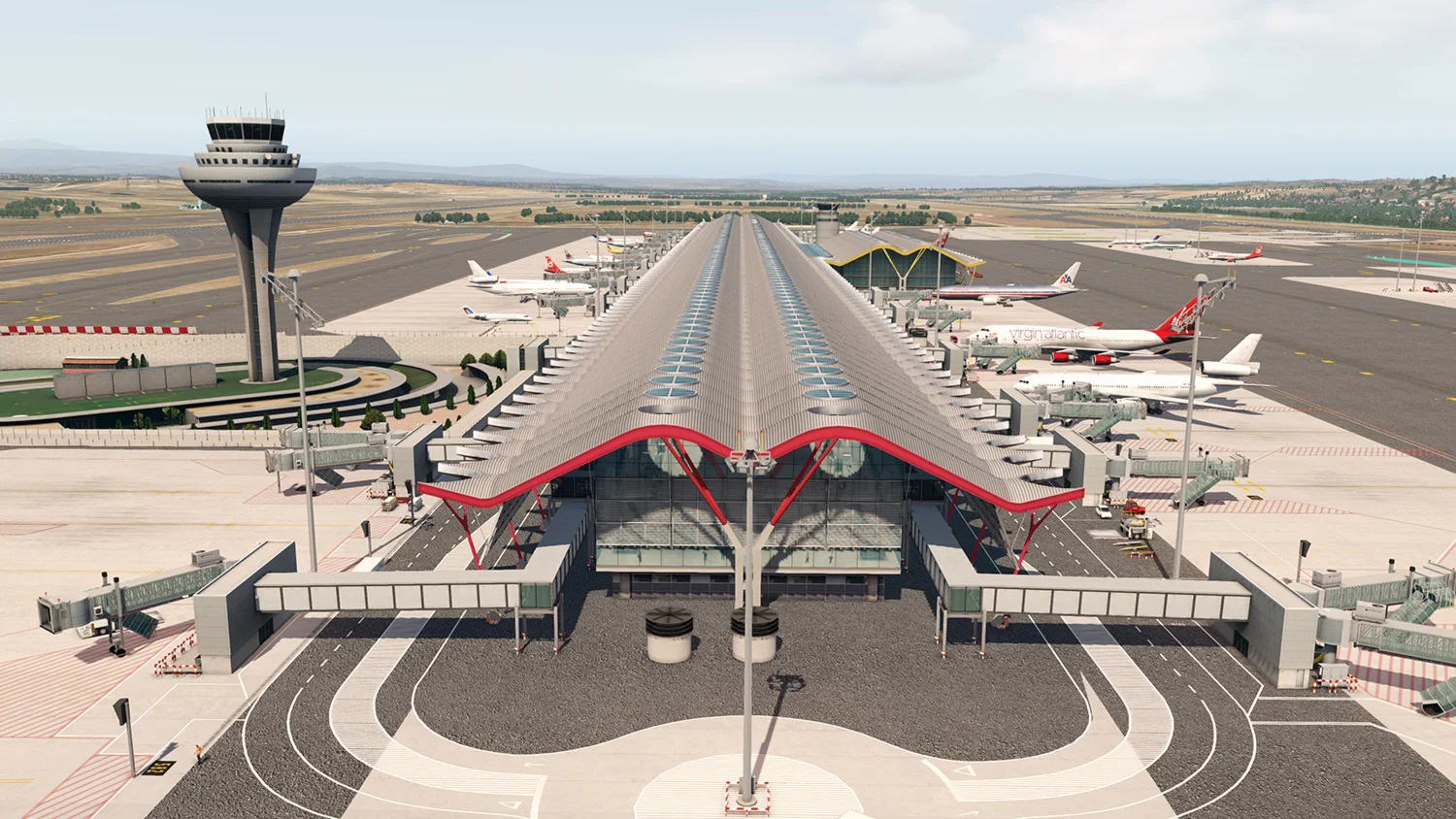 Sim-wings presents the Airport Madrid with all buildings and service facilities for X-Plane 11. The aerial image covers a total surface of 400 km², and the detailed 3D models and animations bring the scenery to life.