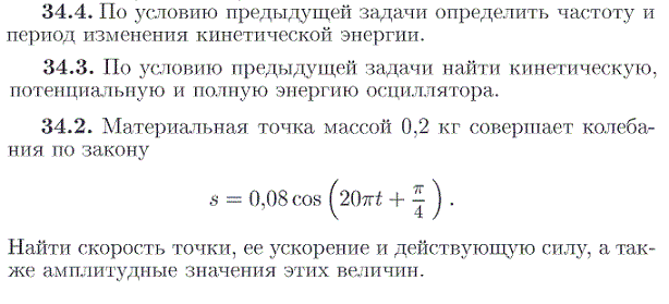 По условию предыдущей задачи определить частоту и период изменения кинетической энергии. 34.3. По условию предыдущей задачи найти кинетическую, потенциальную и полную энергию осциллятора. 34.2. Материальная точка массой 0,2 кг совершает колебания по закону s=0,08 cos (20pi·t +pi/4 ) . Найти скорость точки, ее ускорение и действующую силу, а также амплитудные значения этих величин.
