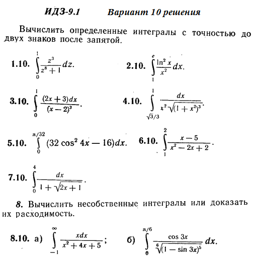 Решения 7-и определенных интегралов и 2-х несобственных из Рябушко части 2 ИДЗ 9.1 вариант 10