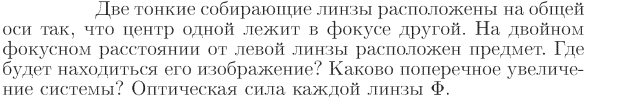 Две тонкие собирающие линзы расположены на общей оси так, что центр одной лежит в фокусе другой. На двойном фокусном расстоянии от левой линзы расположен предмет. Где будет находиться его изображение? Каково поперечное увеличение системы? Оптическая сила каждой линзы Ф.