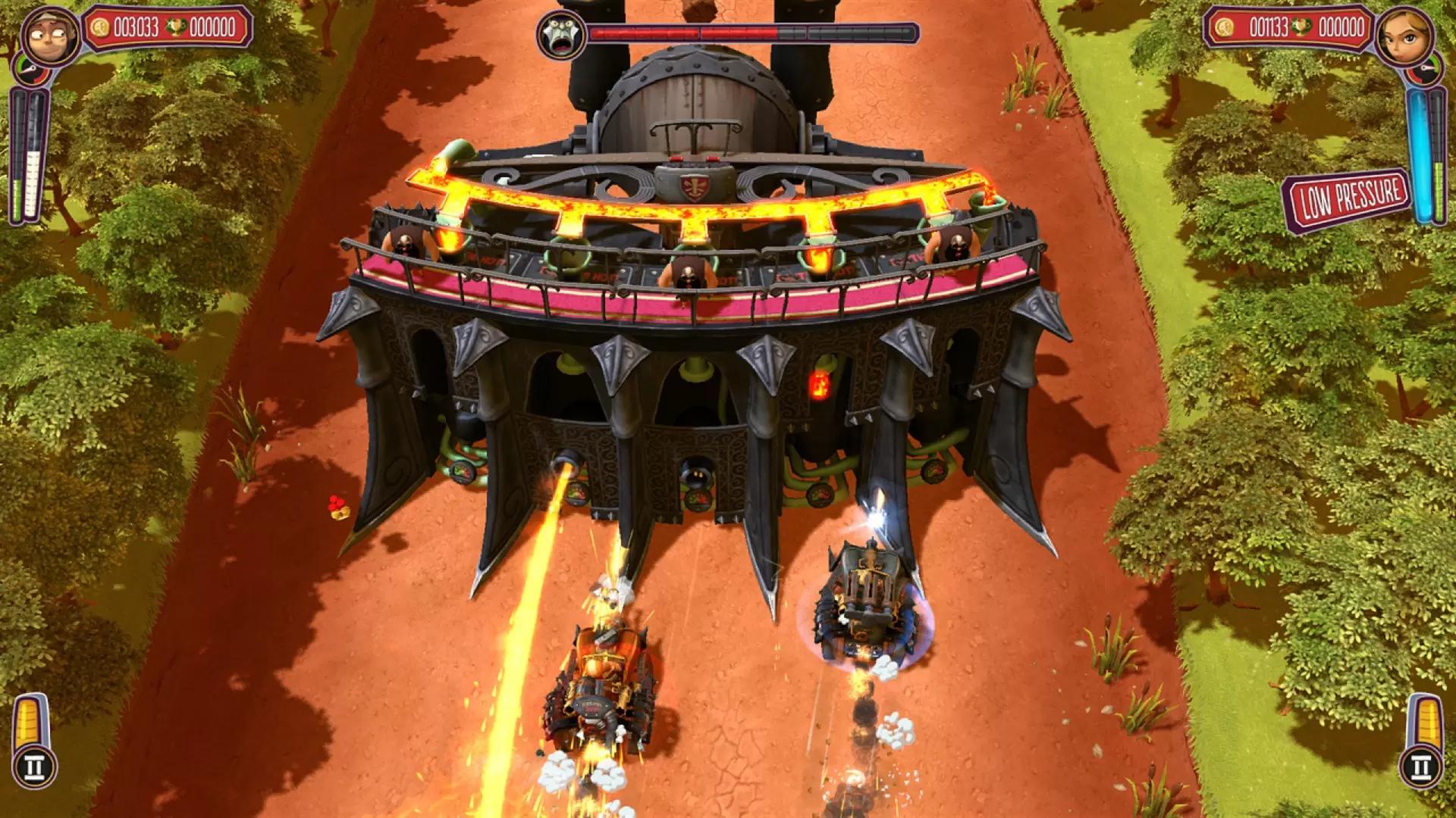 Классические аркадные гонки в фантастическом мире стимпанка. Сражайтесь с жуткими противниками и ведите паровую машину через своеобразный фантастическим мир. Игра "Pressure" открывает вам двери в новый, фантастический и опасный мир. Только вы на своей паровой машинке сможете остановить злого графа Мыла и помешать ему спустить все запасы воды на Роковое Спа! Сражайтесь с жестокой Личной Охраной, поднимитесь по высохшим руслам рек и бурным порогам! Это гонки со взрывным сюжетом и своеобразным юмором, настоящее концентрированное развлечение! Играйте в одиночку или на пару с другом. Вооружайтесь, прыгайте в машину и не забывайте следить за давлением!