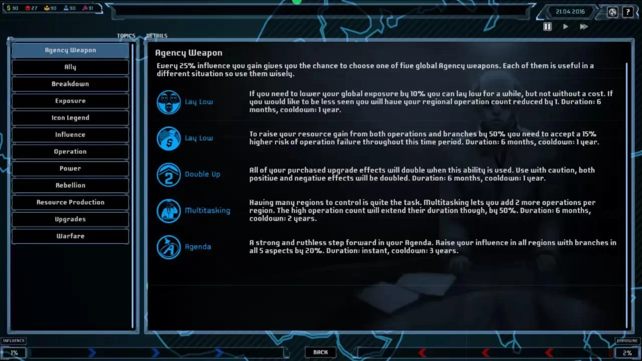 Agenda - это стратегический симулятор, в котором вы управляете независимым международным агентством, чтобы добиться мирового господства. Попытайтесь расширить свое влияние в мире с помощью союзников и секретных операций, которые не исключают убийств, подкупа и мошенничества. Особенности Планируйте и проводите операции для расширения влияния и укрепления власти Пять аспектов власти Сбор ресурсов, различные факторы риска при проведении операций Супероружие Союзники, восстания, войны и катастрофы