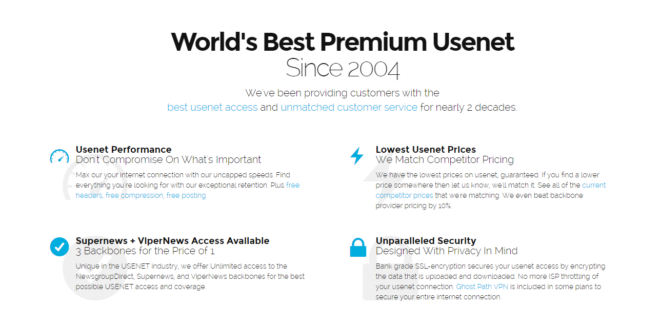 Лучшая в мире сеть Usenet премиум-класса с 2004 года. Мы предоставляем клиентам лучший доступ к сети Usenet и непревзойденное обслуживание клиентов уже почти два десятилетия.