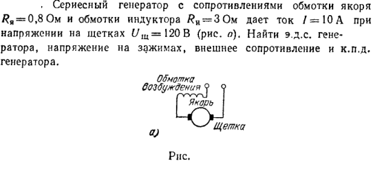 Сериесный генератор с сопротивлениями обмотки якоря Rя = 0,8 Ом и обмотки индуктора Rи = 3 Ом дает ток I = 10 А при напряжении на щетках Uщ = 120 В (рис. , а). Найти э.д.с. генератора, напряжение на зажимах, внешнее сопротивление и к.п.д. генератора.