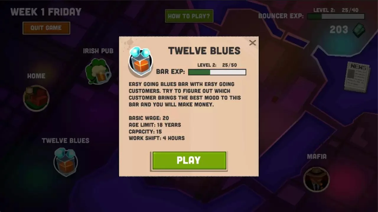Действие игры Bouncer Story происходит в городе, где сильно влияние мафии. Играя за вышибалу, вы наблюдаете за посетителями бара, слышите их разговоры и вольно или невольно становитесь соучастником разворачивающихся событий. Вы сами решаете, как выстраивать отношения с мафиози, полицейскими и другими жителями города. Выберите свой стиль игры. Устраивайтесь на работу в новые бары. Развивайте профессиональные навыки. Исследуйте различные варианты развития событий. Выполняйте побочные задания. Общайтесь и знакомьтесь с другими жителями города. Открывайте разные концовки игры Bouncer Story. По сюжету Bouncer Story вы крупно проигрались и вынуждены работать вышибалой в баре, чтобы погасить долг перед мафией. Сделать это не так просто, поскольку рядом с вами совершаются тяжкие преступления, что усугубляет и без того напряженные отношения между мафией и полицией. Вы должны решить, кому будете помогать и каким образом. Во время игры вы взаимодействуете с людьми, стоящими в очереди в бар. Вы как вышибала решаете, кого пропустить в бар, а кого — нет. От вашего выбора зависит, насколько благоприятной будет атмосфера в баре, а значит — и сколько чаевых вы получите сверх оклада. Заработок можно потратить на развитие профессиональных навыков, оплату аренды или погашение долга перед мафией, а если вы чувствуете, что вам сегодня везет, можно рискнуть и сыграть в блек-джек. Играя в Bouncer Story, вы будете общаться и знакомиться с другими жителями города.
