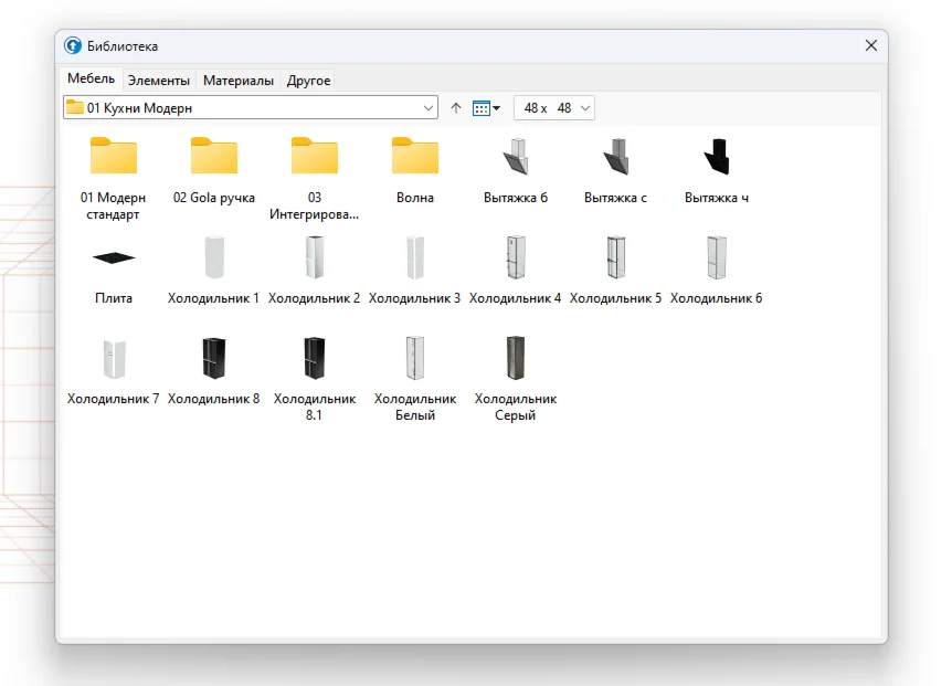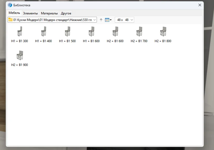 В комплекте идёт большая новая библиотека кухонь и шкафов 2024 года.