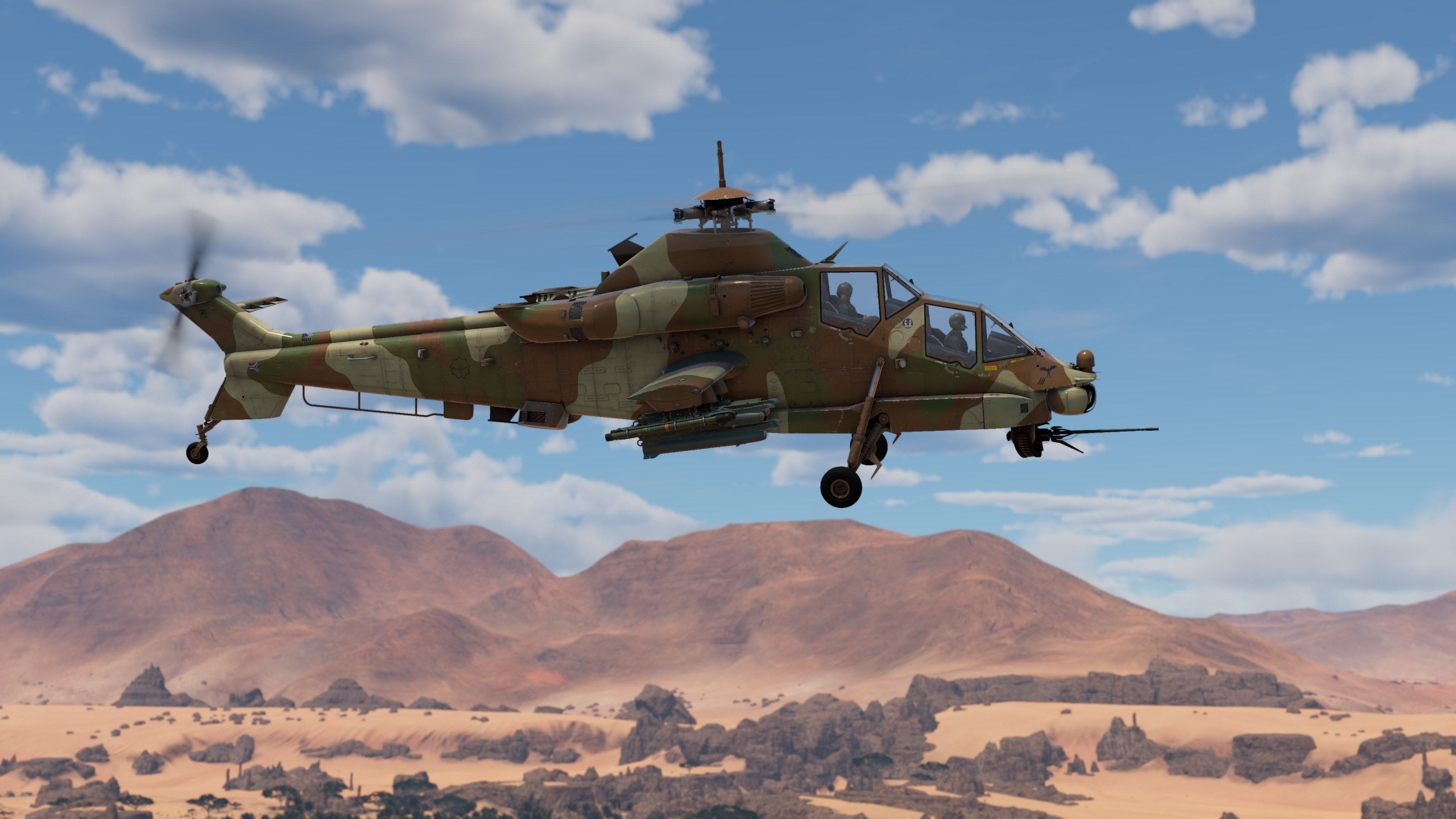 Rooivalk Mk1F CSH - ударный вертолет, разработанный южноафриканской компанией Denel Aerospace Systems в конце 1980-х гг. Прототип совершил свой первый полет в 1990 году, в дальнейшем машина неоднократно модернизировалась, и в 2011 году, версия Mk1F CSH начала поставляться на вооружение в вооруженные силы ЮАР. Вооружен Rooivalk Mk1F CSH 20-мм автоматической пушкой GI-2 в носовой поворотной турели. В качестве подвесного вооружения, вертолет может нести до семидесяти шести неуправляемых ракет FZ, до шестнадцати управляемых ракет “воздух-поверхность” Mokopa, а также четыре управляемые ракеты “воздух-воздух” Mistral, расположенные на выделенных пилонах. Дополнительно вертолет оснащен тепловизором, а также ложными тепловыми целями в качестве системы противодействия.