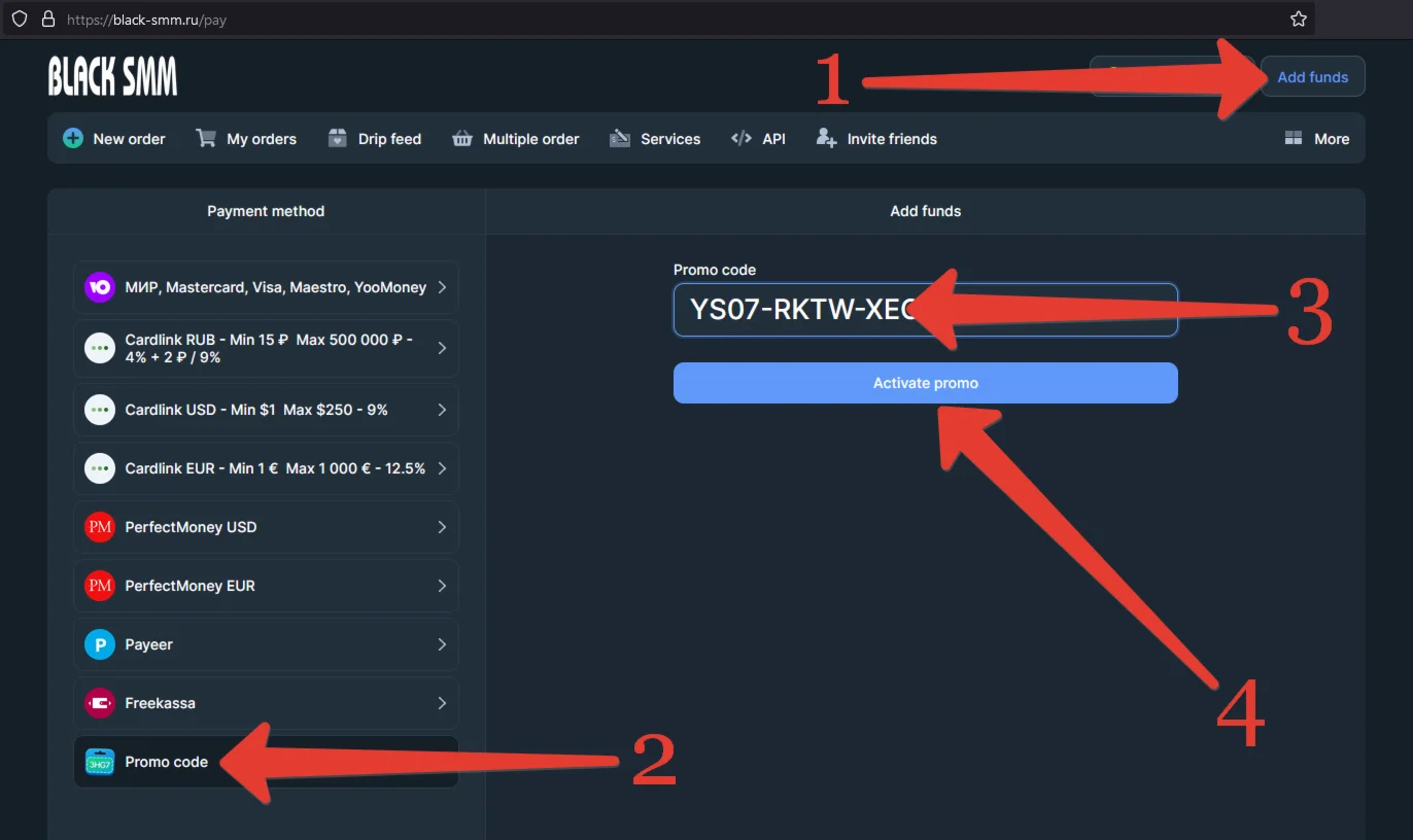Активируйте полученный промокод в личном кабинете на странице https://black-smm.ru/pay. http://my.digiseller.com/preview/65437/p1_3382510_1bbe29db.png