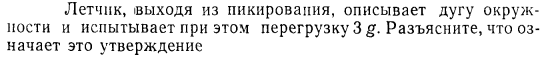Летчик, выходя из пикирования, описывает дугу окружности и испытывает при этом перегрузку 3g. Разъясните, что означает это утверждение