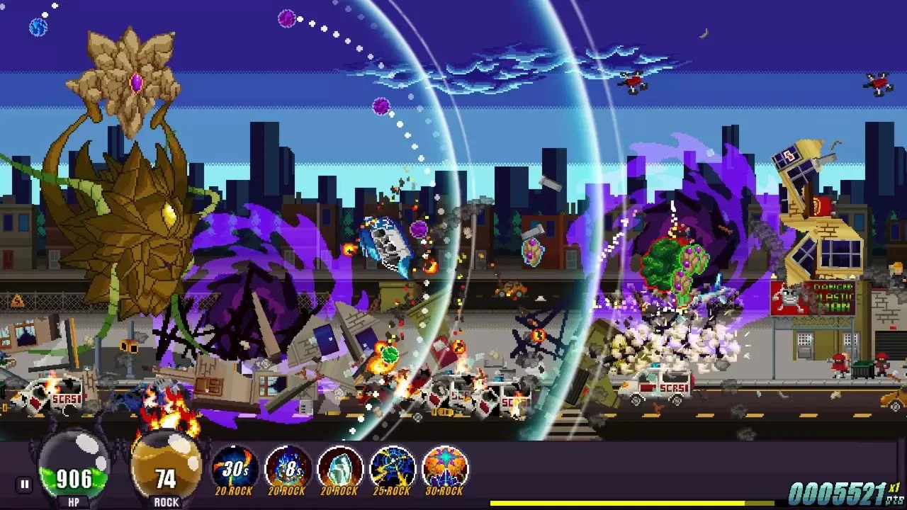 Игра в раннем доступе Приобретите игру и начните играть — примите участие в ее развитии. As a little kid, picking up your dragon toys, spewing fire, feels powerful, and destroying everything is one of the best childhood memories for many of us. Now you become that giant monster in Gigapocalypse, a 2D pixel art destruction game, inspired by classical Kaijū movies such as “Godzilla” and “King Kong” and the game classic “Rampage”. Gigapocalypse features a selection of different “Gigas” from the Prehistoric Era, the uncharted outer space, and the forgotten history. Each with unique skills, mutations, and manifold skins that can be unlocked with level-ups. Start your destruction spree and destroy everything on your way through different beautifully detailed pixel-style locations. Ever wondered how it looks like when a giant monster destroys a wild west town? Or clashing against the brave Knights Templar? Gigapocalypse has the answer. But beware: Nasty soldiers, wizards, drones, and mechs will do everything to stop you! With each tries your Giga will become more powerful until you will finally make it to the diversified, epic boss fights that await you at the end of each level. Complete quests, take care of your Giga in Tamagotchi-style mini-games, find secrets to upgrade your Giga and its “home” and unlock cutely, but yet lethal pets that accompany you on your journey. Gigapocalypse is loud, punk, metal, anarchy, and a lovely homage to the game and movie classics. It´s a game for the kid in all of us. Nine Gigas with unique abilities and skill trees Six beautifully detailed stages based on earth's past, present, and future timeline Themed enemies and buildings Epic and hilarious boss fights Unlockable minions, skills, and mutations Extra quests and secrets to unlock more abilities for your monsters Fast-paced arcade action with simple controls Satisfying visual destruction in cute pixel art style A heavy metal soundtrack to perfectly complement the chaos Razer Chroma support © 2021 Goody Gameworks © 2021 Headup GmbH, all rights reserved.
