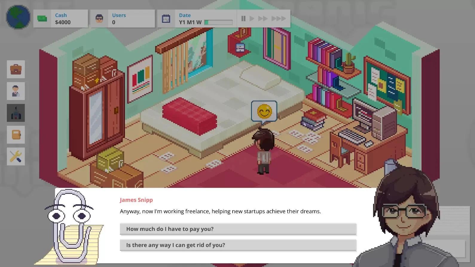 living the Dream Manage your time as a bedroom programmer. Pick projects, contract-work and vacation days to get by, then start to build some passive income through your startup. Beware though: Once you start hiring your first employees and upgrading your office, you'll attract the attention of competing businesses... don't Panic! You decide how each project goes and what to focus on Spend a week training your staff, or earning money, or building features... but choose wisely! Upgrade your company in the skill tree: Will you take longer vacations or cheaper air-co? Hunt for new employees and hire the ones that fit your style: Social butterfly? Marketing expert? Lone Wolf? Compete with rival CEOs for new users in your region, and then expand out by building new headquarters on a world map! Hurting for cash? You can take out a loan or search for investors, but don't think it'll come for free... © 2021 Algorocks © 2021 tinyBuild