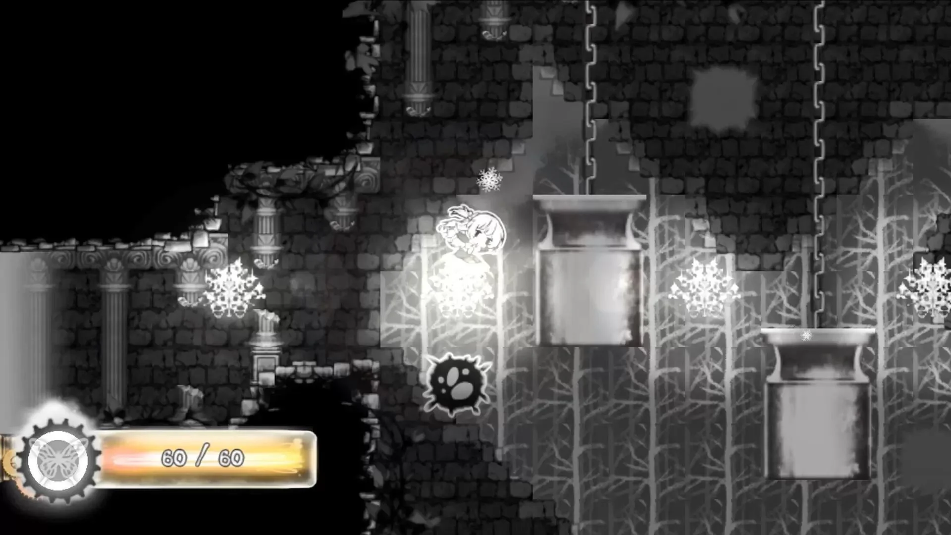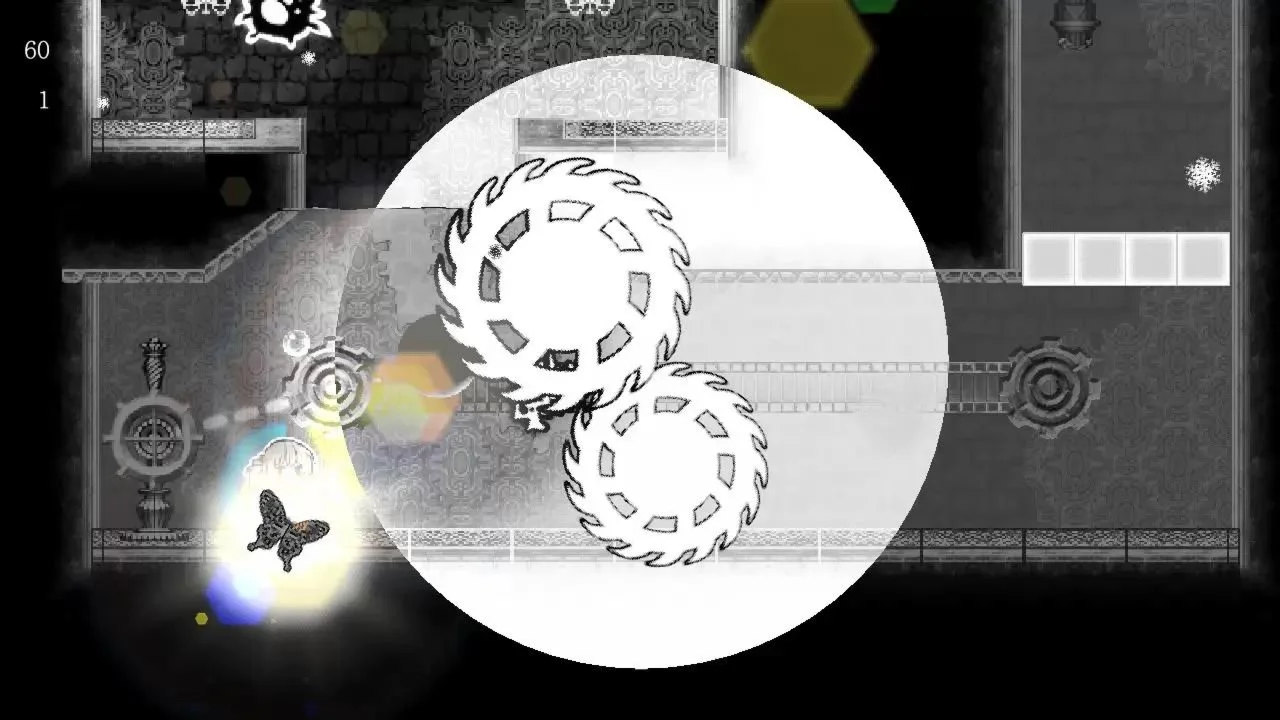 光亮,宁静的村庄 有一天,村子里的一盏路灯一个盏地熄灭。 就这样,光从村子里消失,埋在黑暗中,女孩就向村外的塔走去。 控制着城市灯光的塔. 塔内有一只闪闪发光的蝴蝶。 为了用蝴蝶灯照亮村庄,女孩偷走蝴蝶逃跑了。 守着塔的夜女王试图杀死偷走蝴蝶的女孩, 经过多次曲折,女孩从塔里逃了出来。 但是因少女抢走了蝴蝶,村子里所有的光芒都消失了, 村子的区域消失进黑暗中。 在街上徘徊的不是人,而是影子。 "如果再把蝴蝶放回去,说不定村子会还原。' 少女为了复回失去的光芒和村庄,再次向塔。 用光和阴影拼图 从塔上得到蝴蝶后,少女可以召唤蝴蝶。 召唤的蝴蝶一段时间后会消失,使用法力值能再次召唤。 用蝴蝶的光照亮灯泡,使装置启动。 使用各种影子,创造道路。 若在没有灯光的地方,体力会逐渐减少。 靠近灯光时,体力和法力值自然会恢复。 怪物隐藏在黑暗中,随时出现。 有灯光时,白色的陷阱会消失,但黑色的陷阱就会出现。 相反地,在没有灯光的情况下,黑色陷阱会消失,但白色舰艇会出现。 利用陷阱以损伤怪物头目和怪兽们. 受感染的村庄靠塔内的灯光维持健康 失去光芒后,村庄会复回到原本的残酷面貌。 少女为找回村庄的灯光而进入塔内。 每层需打败怪物头目,点燃每个部分的灯,才能恢复村庄失去的区域。 为了拯救被黑暗吞噬的村民,需要得到塔内藏有的药草。 但是塔内的各种怪物头目与夜之女王目标是杀死少女。 使用蝴蝶的光照亮塔内,解开拼图。 然后用塔的灯光找回失去的村庄来,也治好村民的病症。 可以用跳跃踩死或利用陷阱打败怪物。 组合动作次数越多,恢复的体力也会越多。 控制降落速度或滑动动作以及达到更多组合动作次数。 故事没有对话,通过角色动画表示。 键盘操作可以调整。 键盘外,也可以使用X-box 360,PS4双休克等。