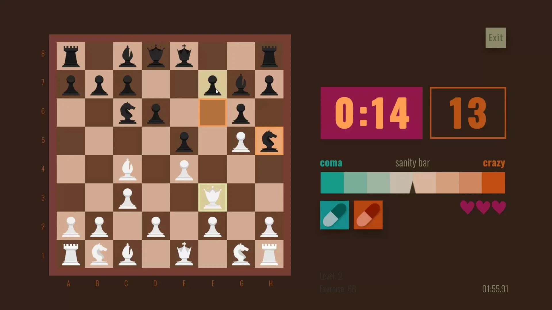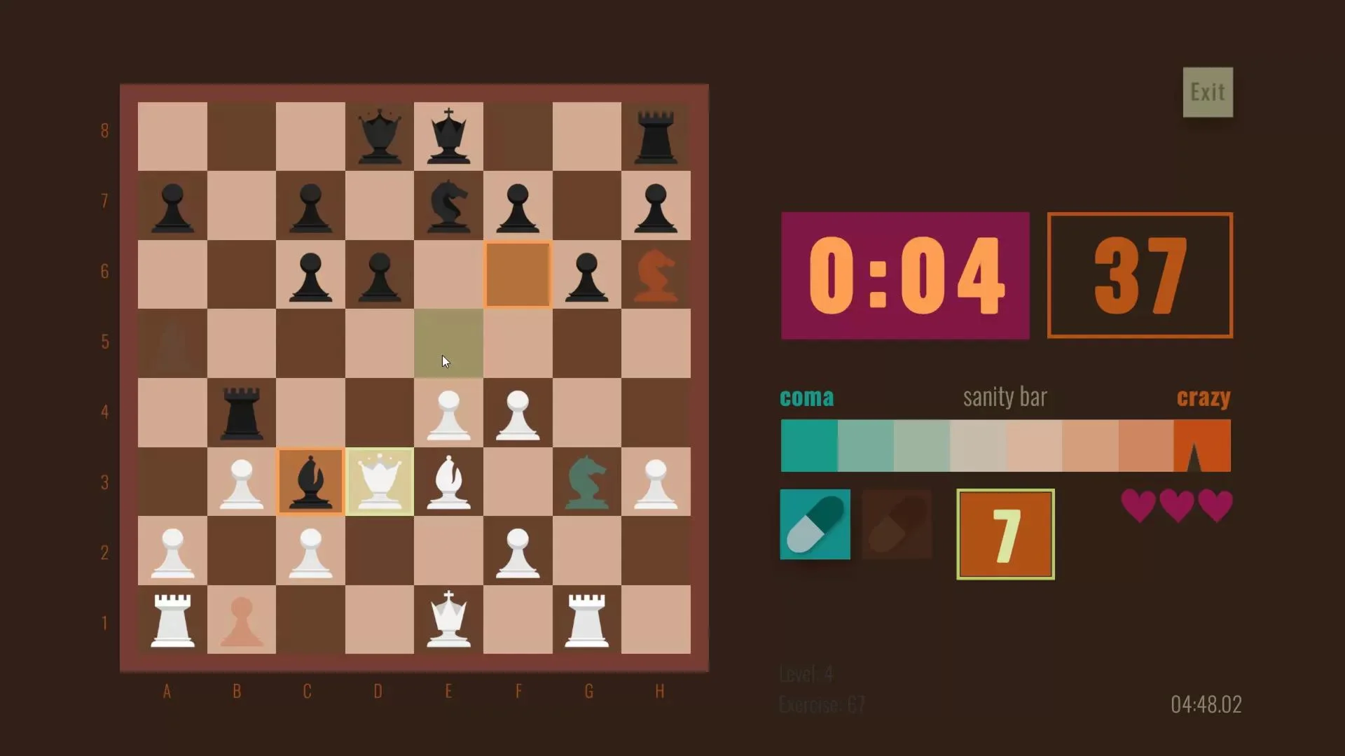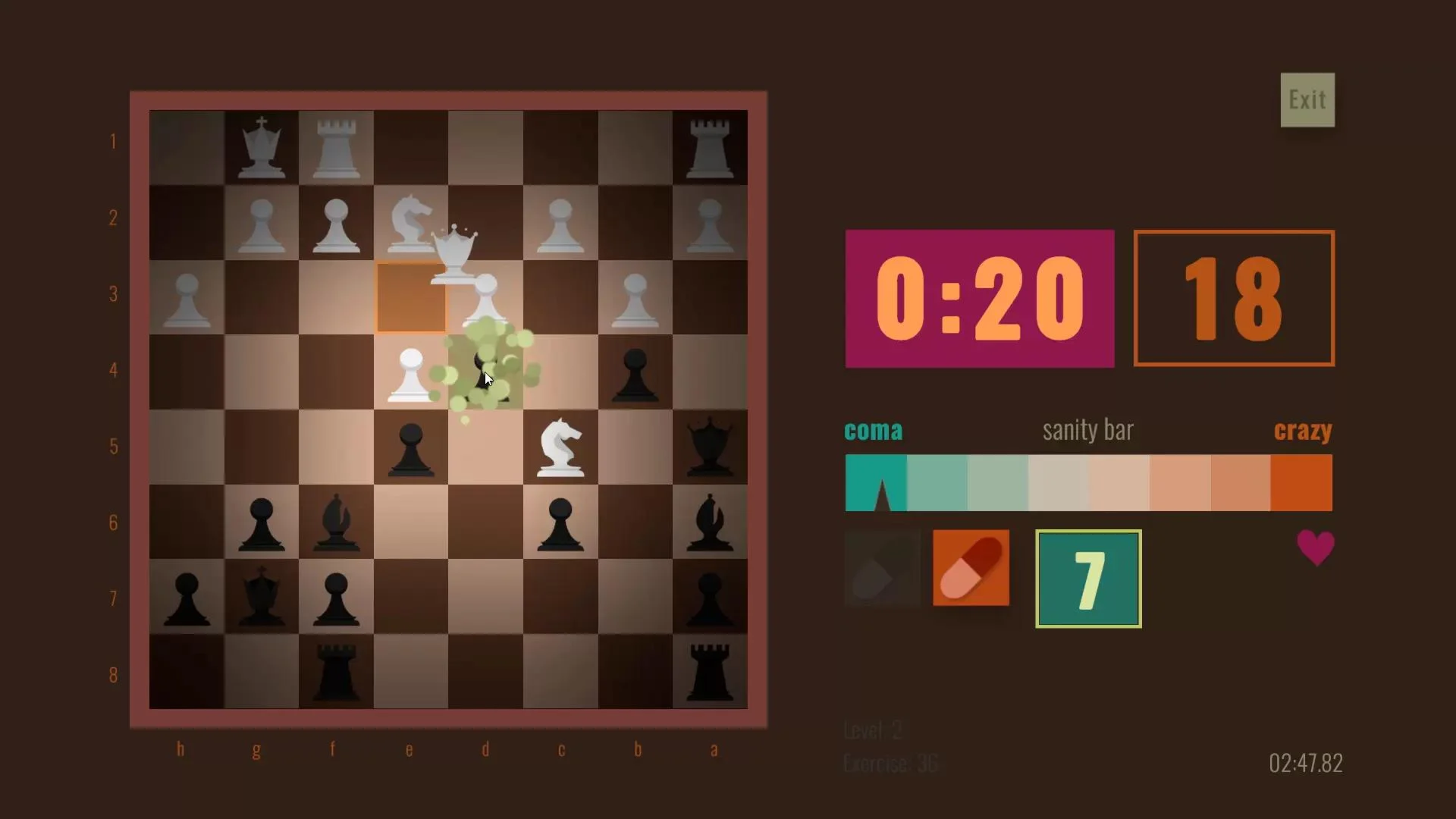 Chess Pills is a quick-paced chess puzzle game where you have to guess the right move in a very short time. PILLS to the rescue Fortunately, you have your pills to aid you: Orange Pill: You get sharp. You immediately focus on the right piece to move. Now it's up to you to guess where the piece goes. Turquoise Pill: You calm down. The time now passes slowly. You can take your time to figure out what to do. But only before the effect runs out. Steam Leaderboard / Local Highscore Challenge yourself and try to beat your personal record. Find out how fast your brain is at chess by checking your position in the Steam Hall of Fame! Constant Challenge The puzzles get more difficult as you survive! Lots of Puzzles More than 3000 puzzles, always displayed in a different order. Each run is a different run!