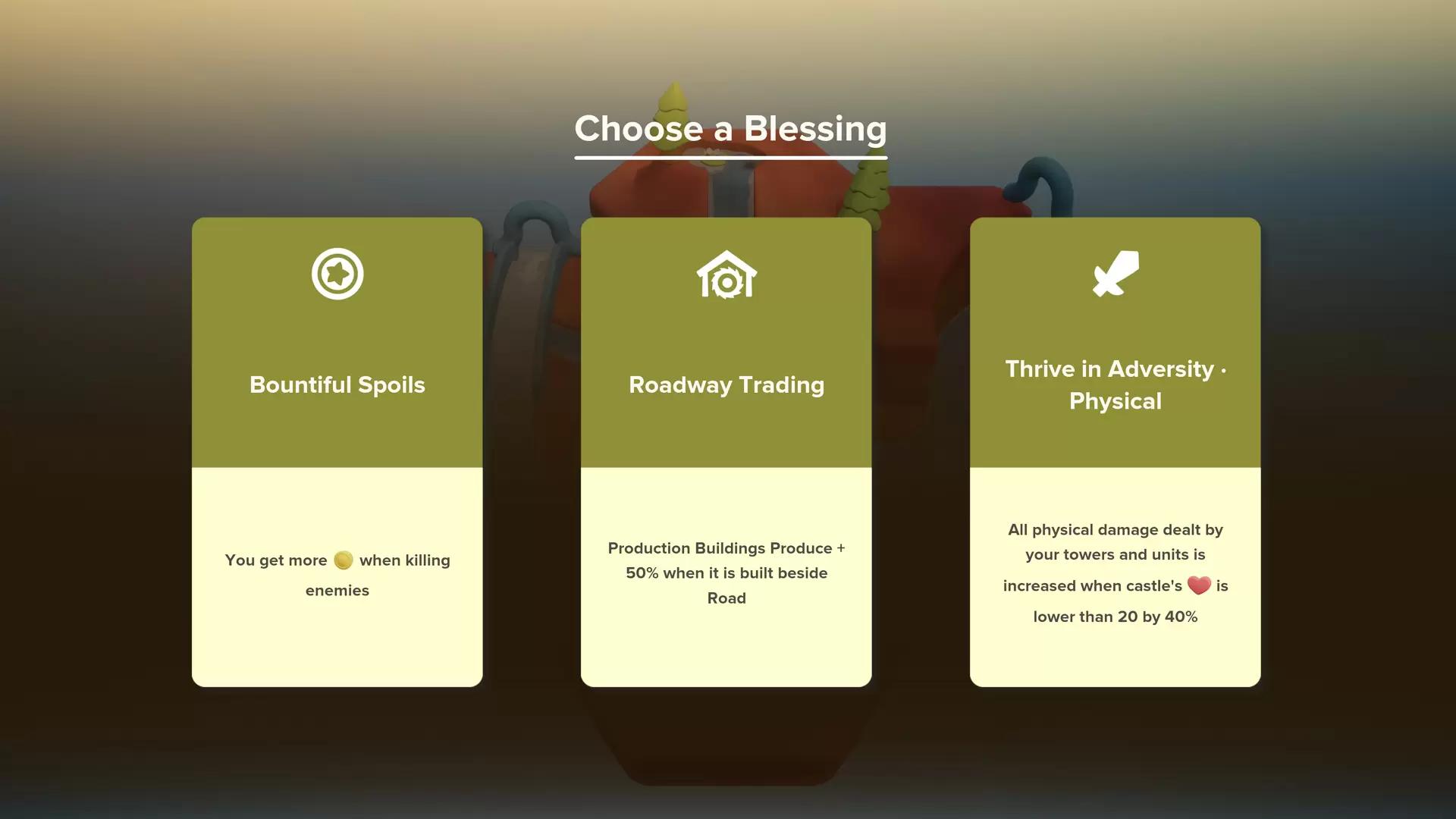 Enjoy two distinct ways to play the game, with standard and challenge modes. Standard Mode - In the standard game mode you will have access to a vast tech tree. Use points earned from previous runs to unlock new towers, units, upgrades, wonders and more. You will also unlock new maps and difficulty settings as you complete your runs. Challenge Mode - Take on a challenge that changes every week. Choose your perks, use your limited resources wisely, and compete on the weekly leaderboard. Shape your realm and control the enemy paths with randomly generated hexagonal tiles. Kill enemies to obtain hexagonal map tiles, match these titles with the existing paths to create longer routes, obtain better building placement options, or close off the loop to stop enemies spawning from the portals. Build towers, recruit armies and learn spells to defeat enemies from land, sea and air. Choose a strategy to defend your realm. Build a variety of towers from simple arrow and bomb launchers to fire and ice towers. Recruit armies of swordsmen, archers and more, and learn powerful spells to slow down and damage enemies as they invade from land, sea and air! Build magnificent wonders to turn the tides of battle. Build large Wonders with unique and powerful abilities to turn the tides of battle. Build support buildings like markets and windmills to earn additional gold to purchase more firepower and upgrades. Use the environment to your advantage Use the terrain and environment to your advantage, place towers on higher elevations to increase their range in the highland maps, or control the weather to slow down or damage enemies. Combine elements to trigger powerful elemental reactions. Defeat challenging bosses and receive blessings. Defeat bosses to unlock a wide range of blessings allowing you to earn more gold, increase the range and damage of your defenses, increase spell power and much more. Survive as many days as you can to unlock new maps, buildings, units, spells and wonders. Earn trophies for each day you survive, then use them to unlock new towers, units, spells, wonders, and other buffs and upgrades. Survive long enough to unlock new maps and difficulty settings.